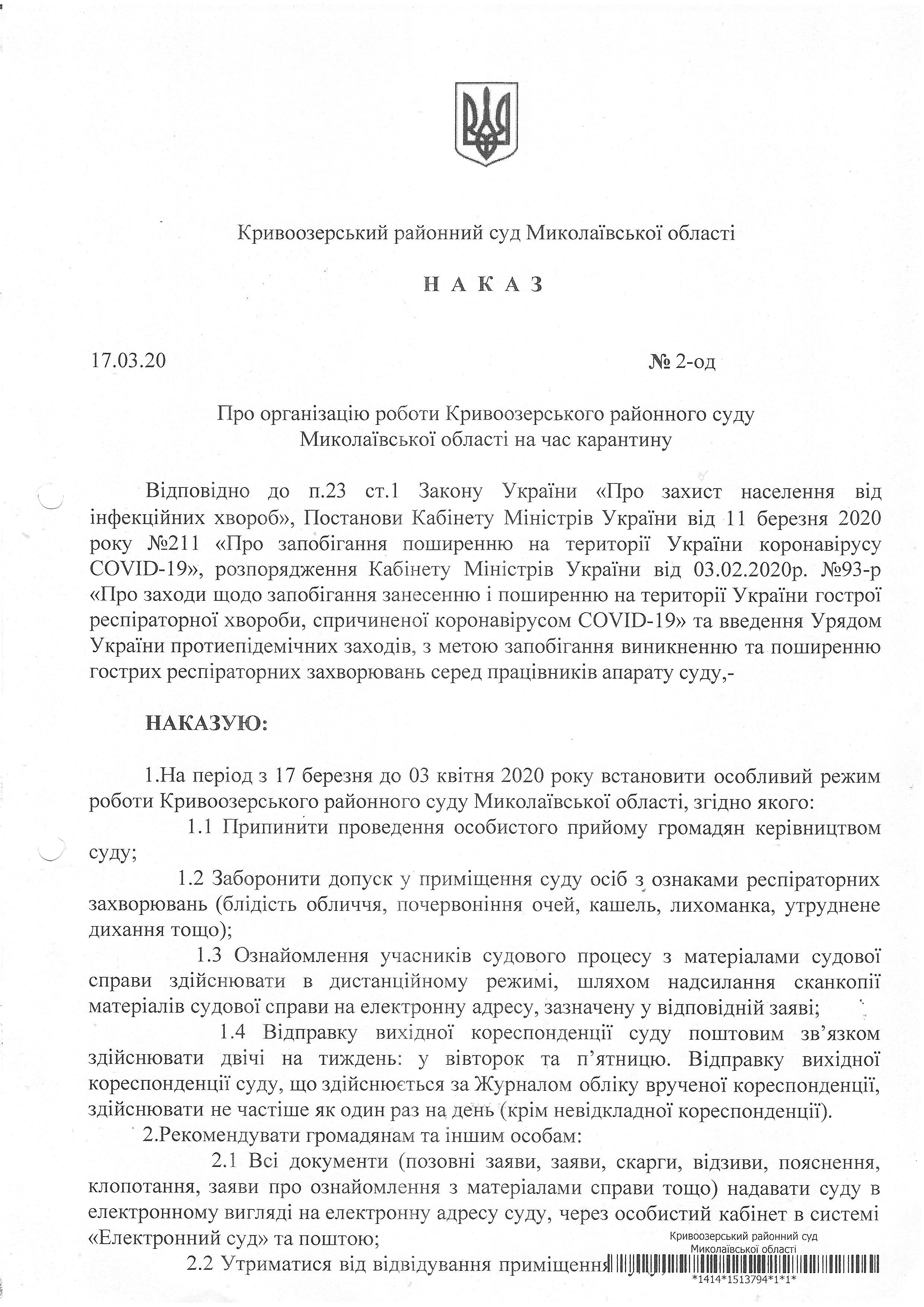 Наказ №2-од "Про організацію роботи Кривоозерського районного суду Миколаївської області на час карантину від 17.03.2020 року