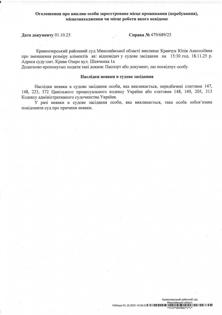 Оголошення про виклик Кравчук Юлії Анатоліївни