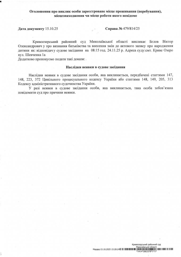 Оголошення про виклик Бєлова Віктора Олександровича