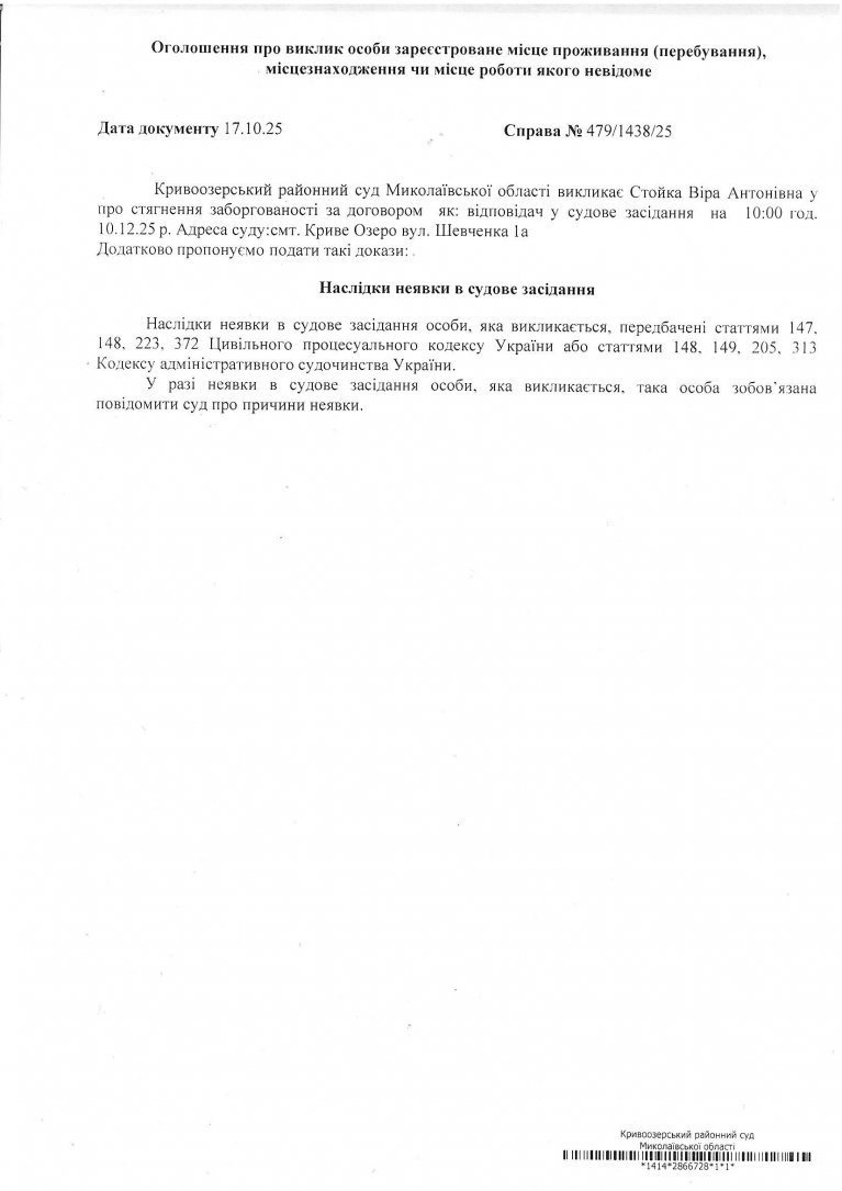 Оголошення про виклик Стойки Віри Антонівни