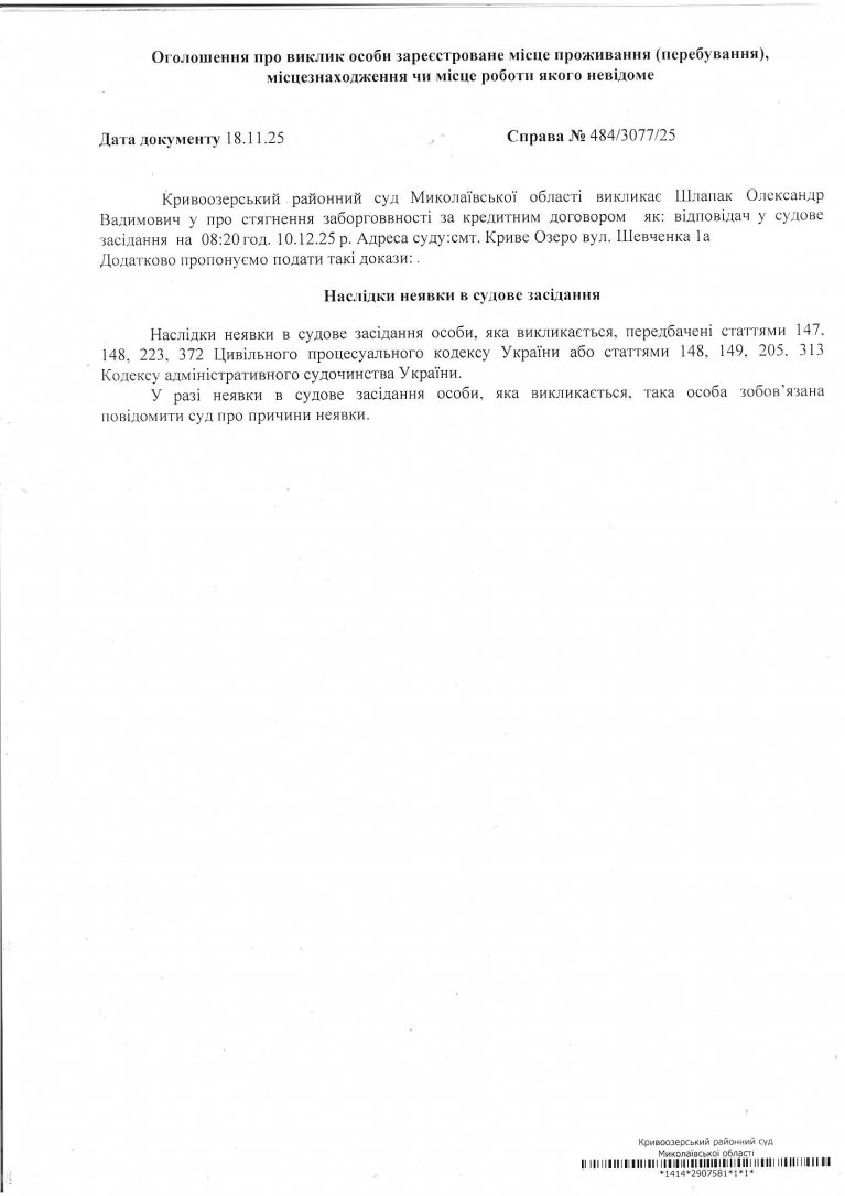 Оголошення про виклик Шлапак Олександра Вадимовича