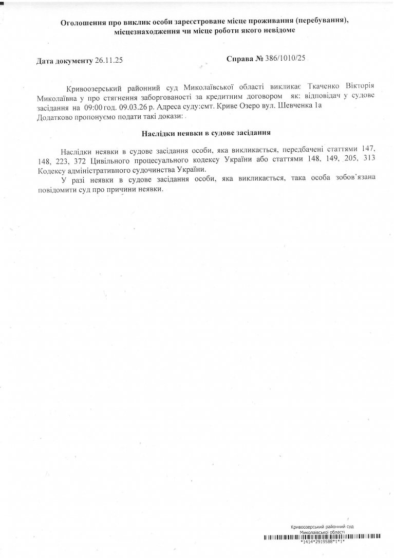 Оголошення про виклик Ткаченко Вікторії Миколаївни