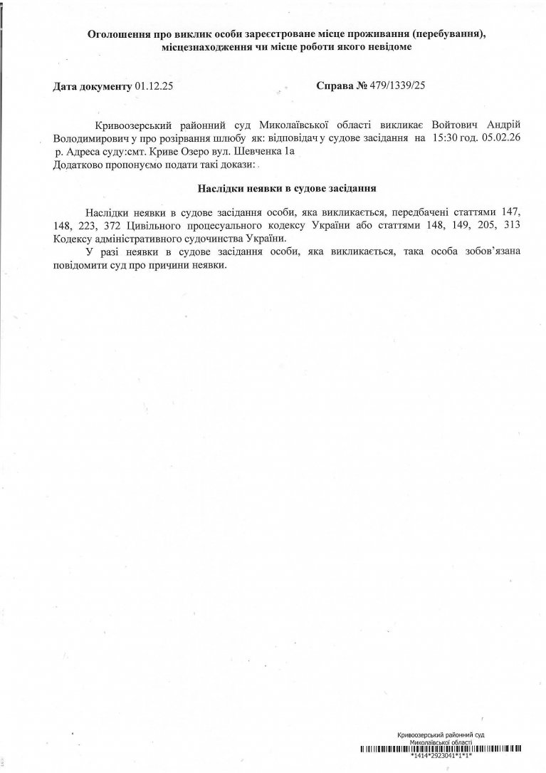 Оголошення про виклик Войтовича Андрія Володимировича