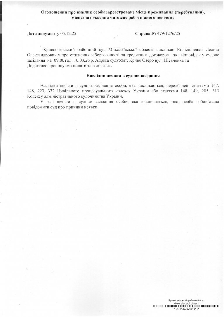 Оголошення про виклик Колісніченка Леоніда Олександровича