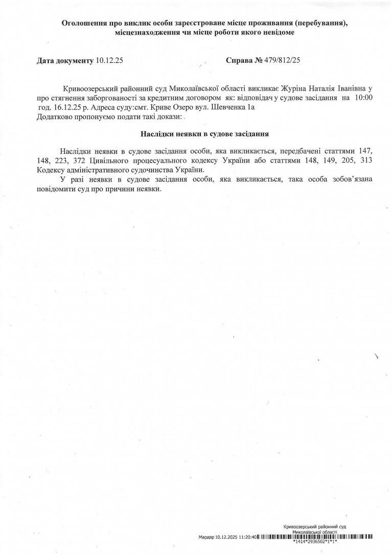 Оголошення про виклик Журіної Наталії Іванівни
