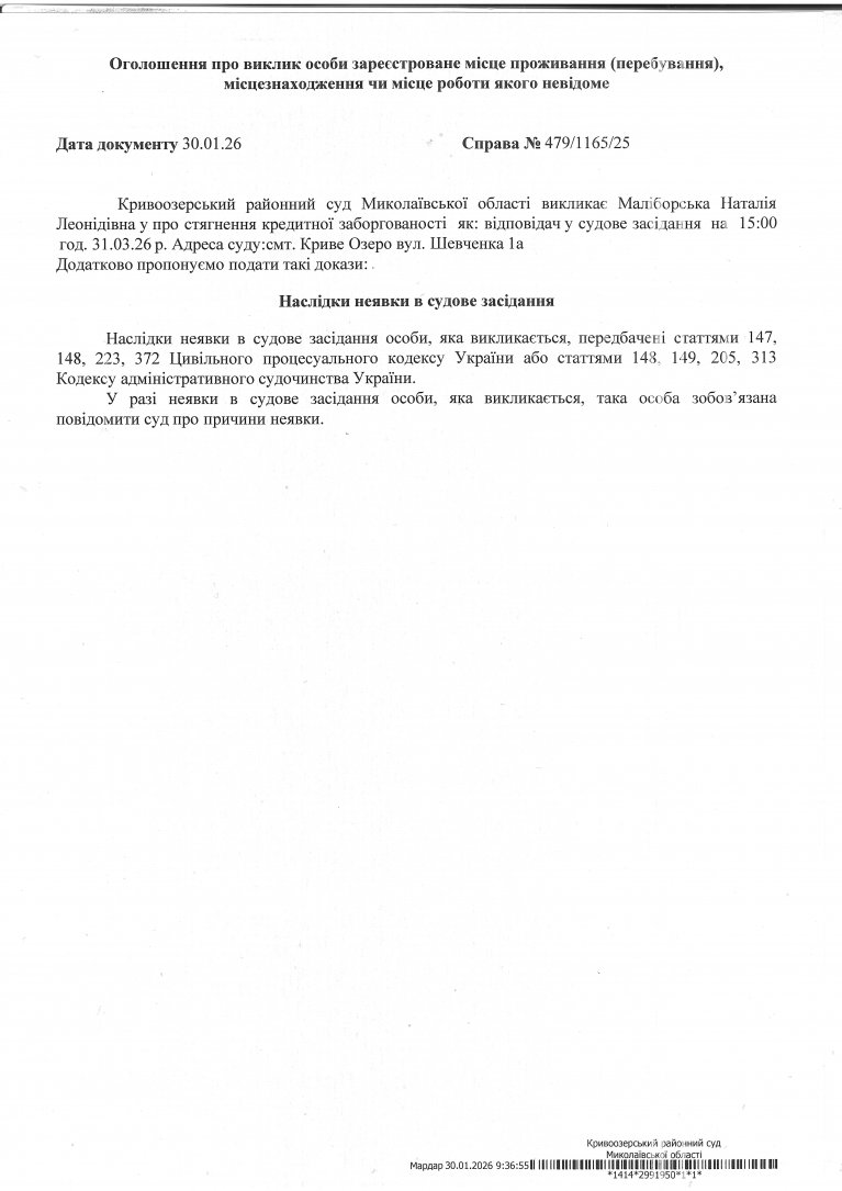 Оголошення про виклик Маліборської Наталії Леонідівни