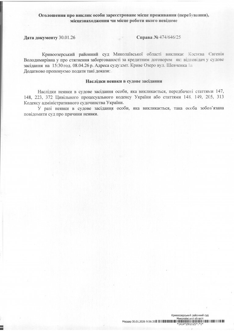 Оголошення про виклик Костєвої Євгенії Володимирівни