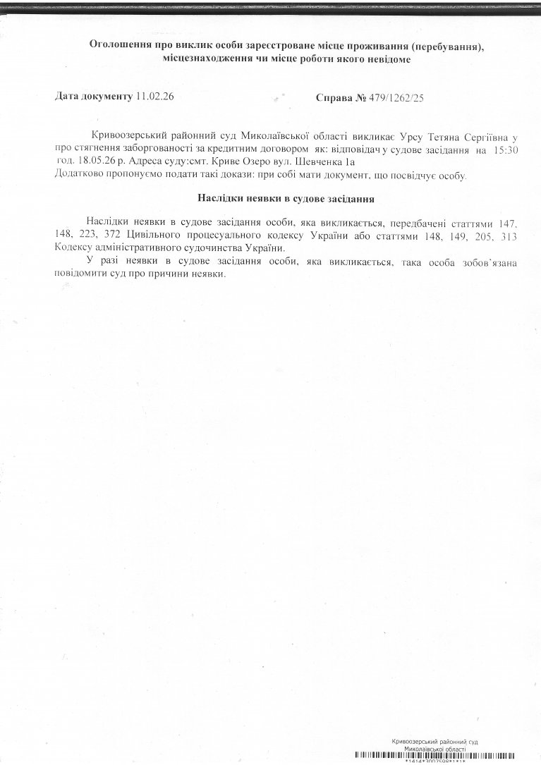 Оголошення про виклик Урсу Тетяну Сергіївну