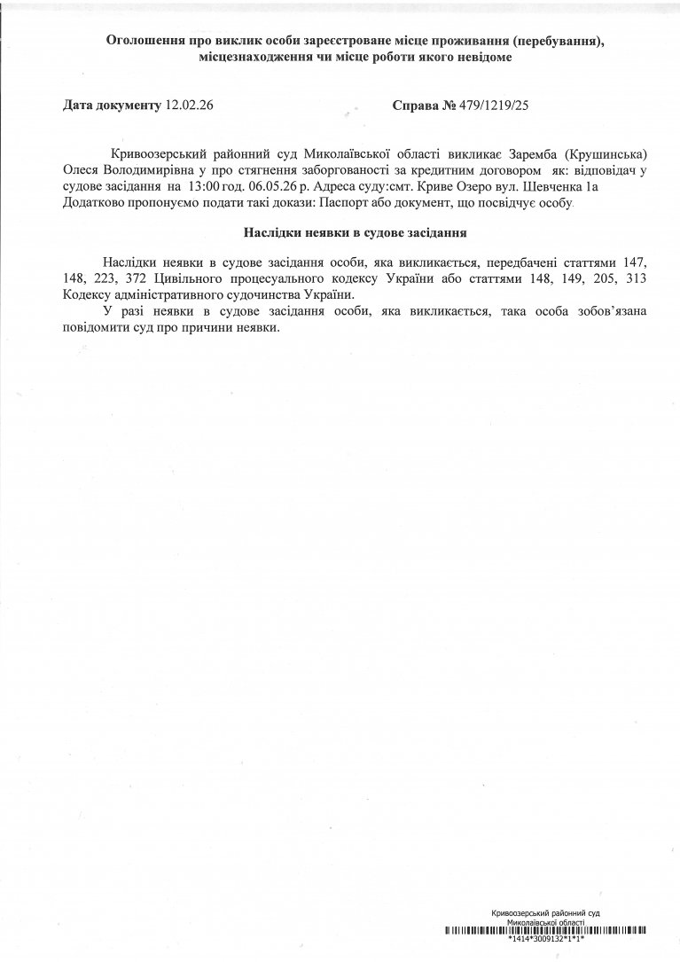 Оголошення про виклик Заремби (Крушинської) Олесі Володимирівни