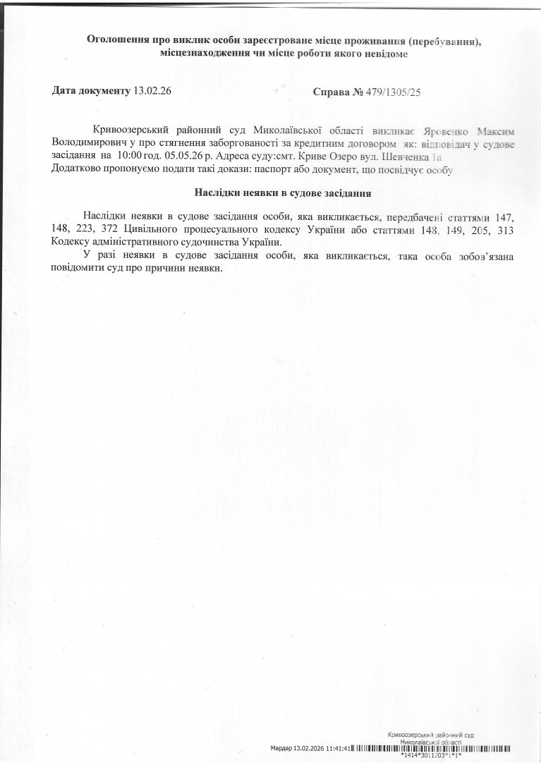 Оголошення про виклик Яровенко Максима Володимировича