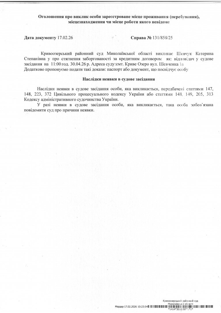 Оголошення про виклик Шевчук Катерини Степанівни