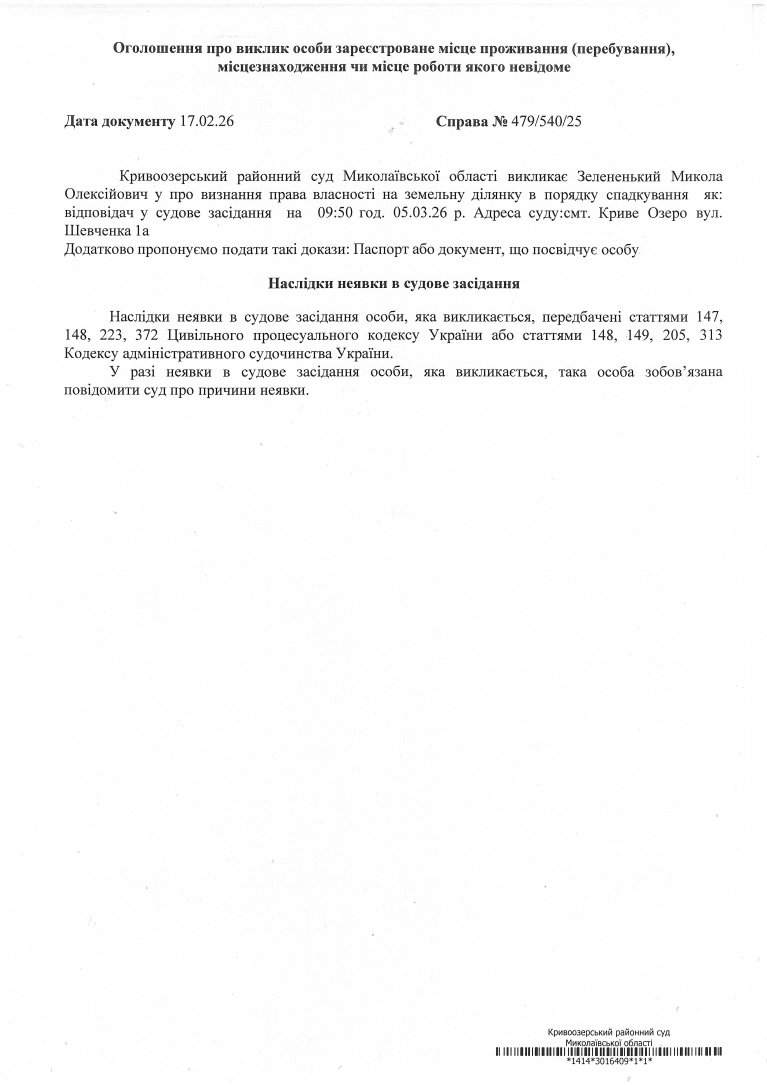 Оголошення про виклик Зелененького Миколи Олексійовича