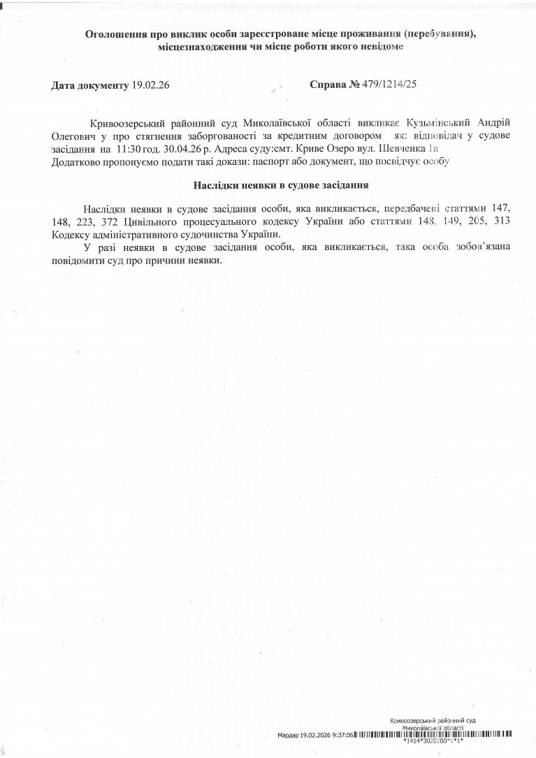 Оголошення про виклик Кузьмінського Андрія Олеговича