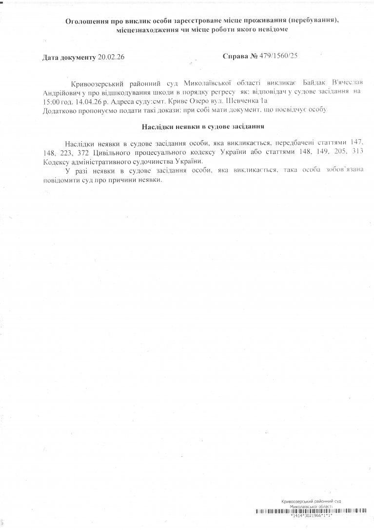 Оголошення про виклик Байдак В'ячеслава Андрійовича