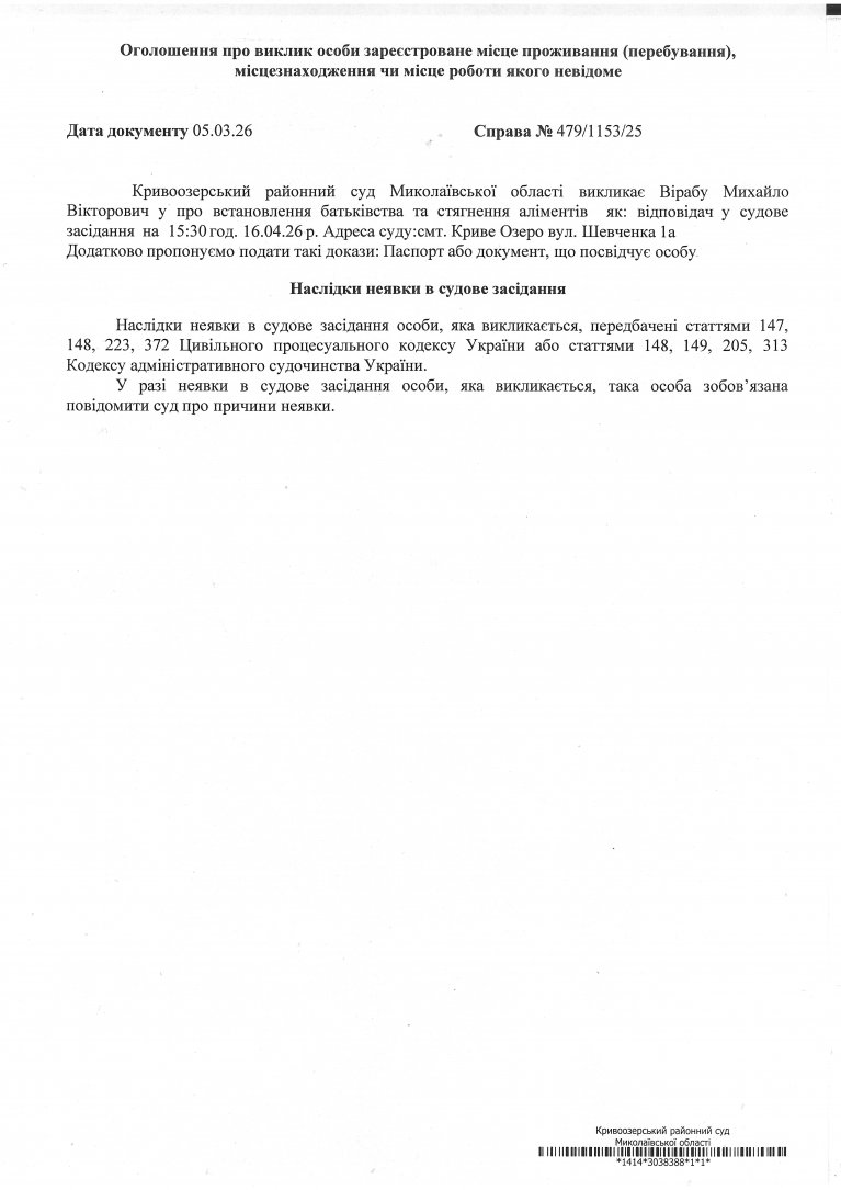 Оголошення про виклик Вірабу Михайла Вікторовича