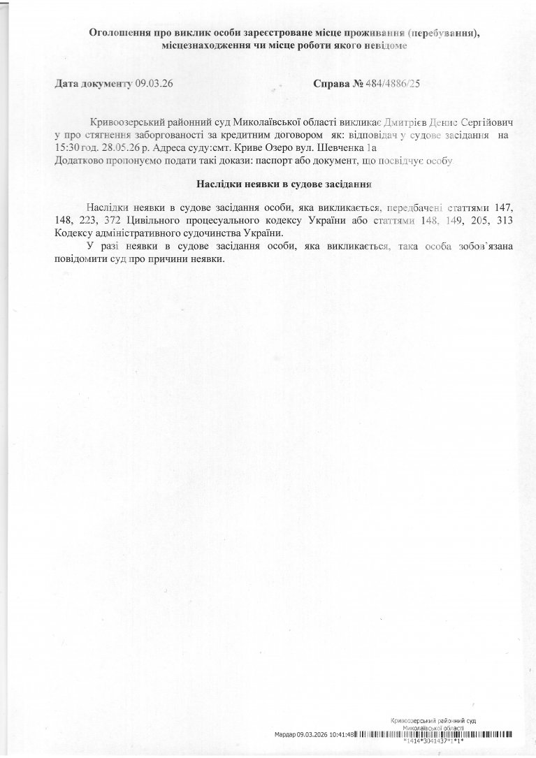 Оголошення про виклик Дмитрієва Дениса Сергійовича
