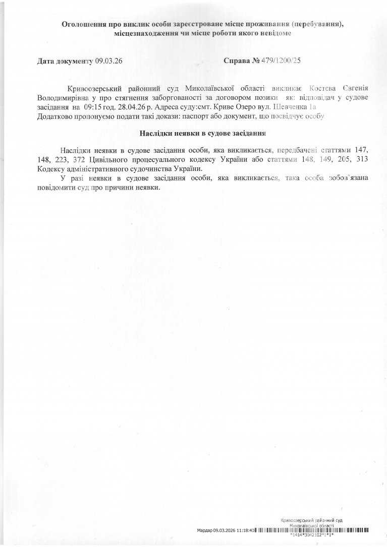 Оголошення про виклик Костєвої Євгенії Володимирівни