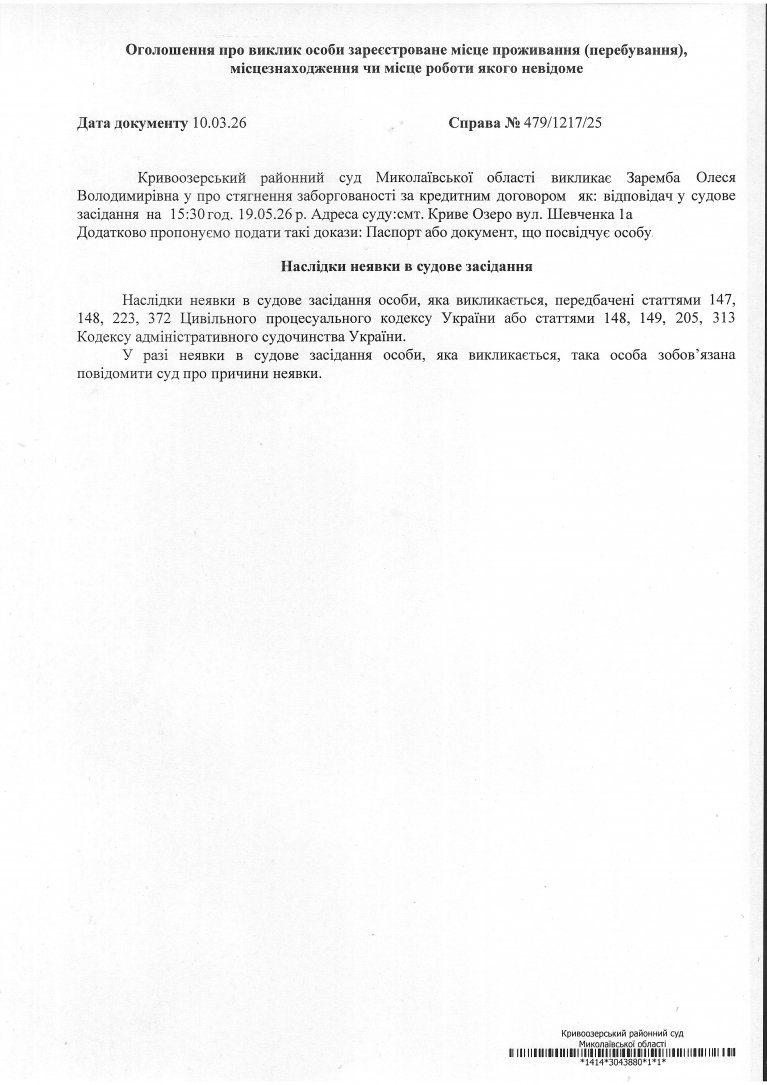 Оголошення про виклик Заремби Олесі Володимирівни