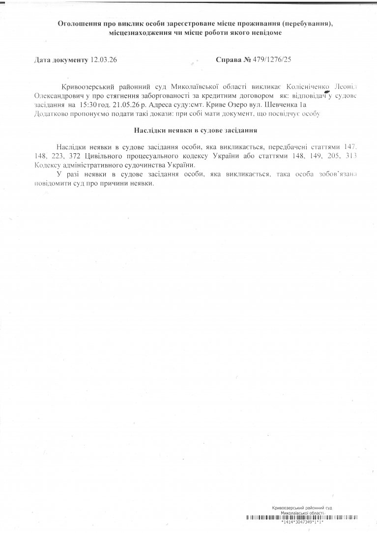 Оголошення про виклик Колісніченка Леоніда Олександровича