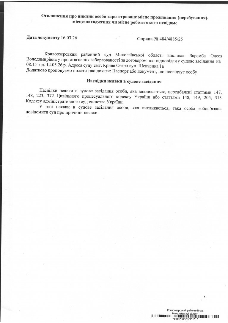 Оголошення про виклик Заремби Олесі Володимирівни