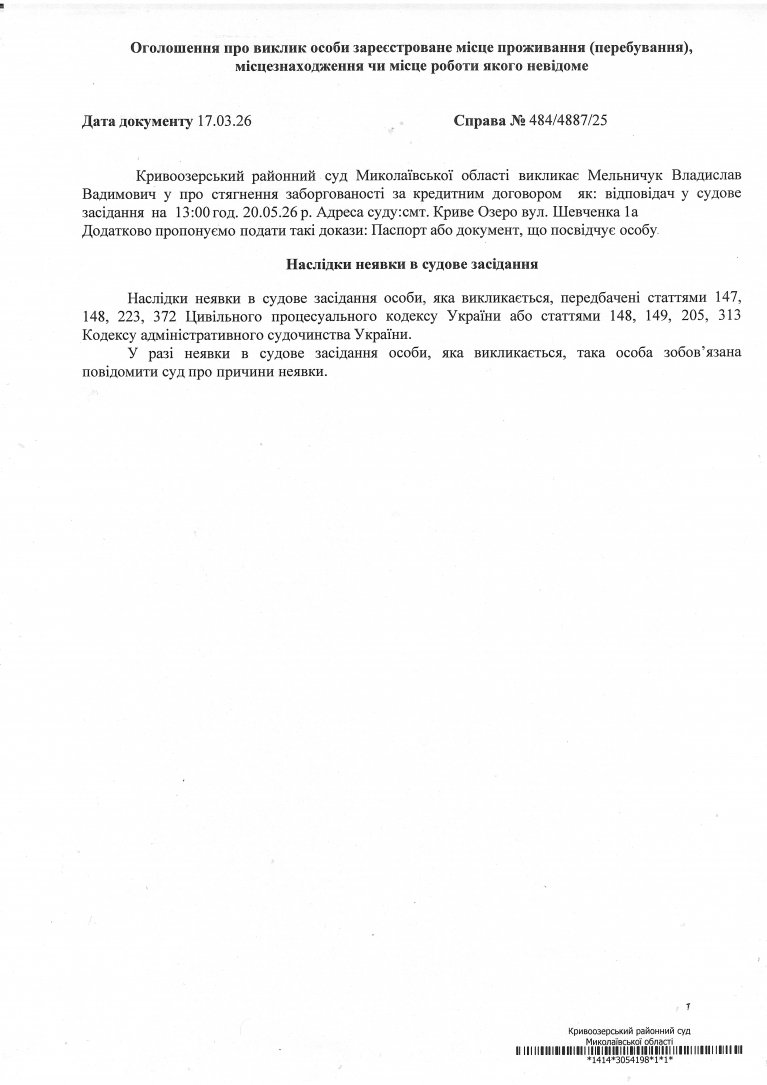 Оголошення про виклик Мельничука Владислава Вадимовича