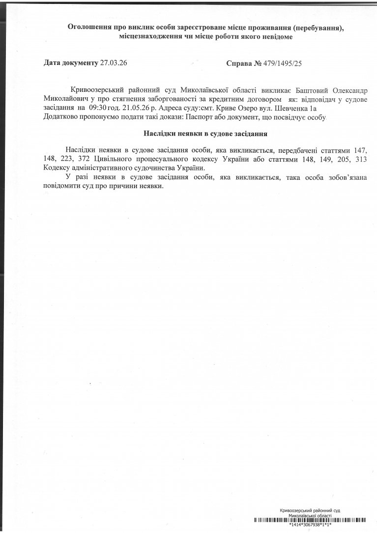Оголошення про виклик Баштового Олександра Миколайовича