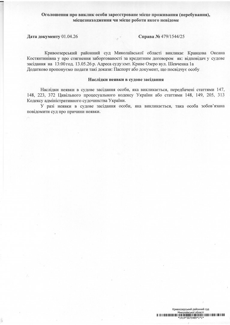 Оголошення про виклик Кравцової Оксани Костянтинівни