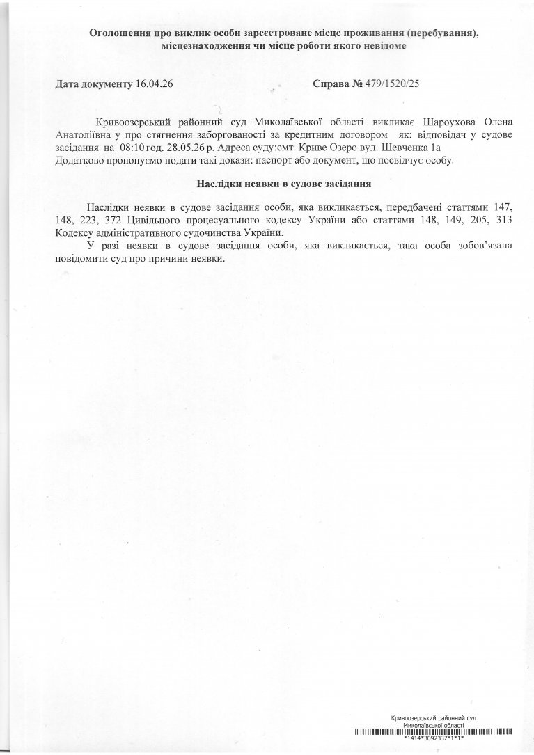 Оголошення про виклик Шароухової Олени Анатоліївни
